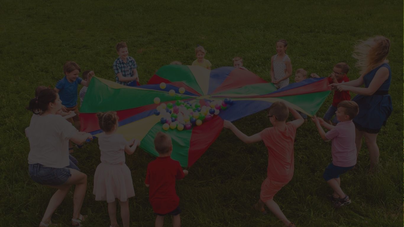 None! We bring all the necessary equipment, music, and props (parachutes, tunnels, balls, etc.) for all the games and activities. We simply need access to a suitable venue with an electrical outlet for our sound system, and a clear, safe space to play — at least 15x15 feet.